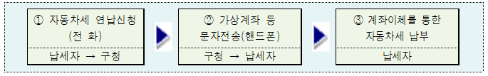 ○ 자동차 등록지 관할구청에 전화로 연납신청 후, 납부세액 및 가상계좌를 문자로 전송받아 계좌이체를 통해 납부할 수 있습니다.