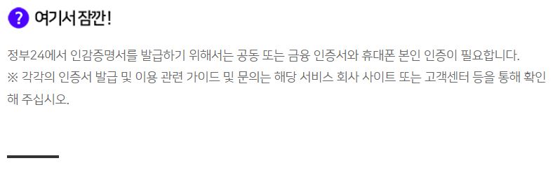 본인 확인 등을 위해 사용되는 인감증명서는 철저한 보안, 개인정보 보호, 도용 방지를 위해 두 번의 본인인증 절차(복합인증)가 필요합니다. 서비스 이용 전에 미리 인증서를 준비하시면 편리하게 이용하실 수 있습니다.
