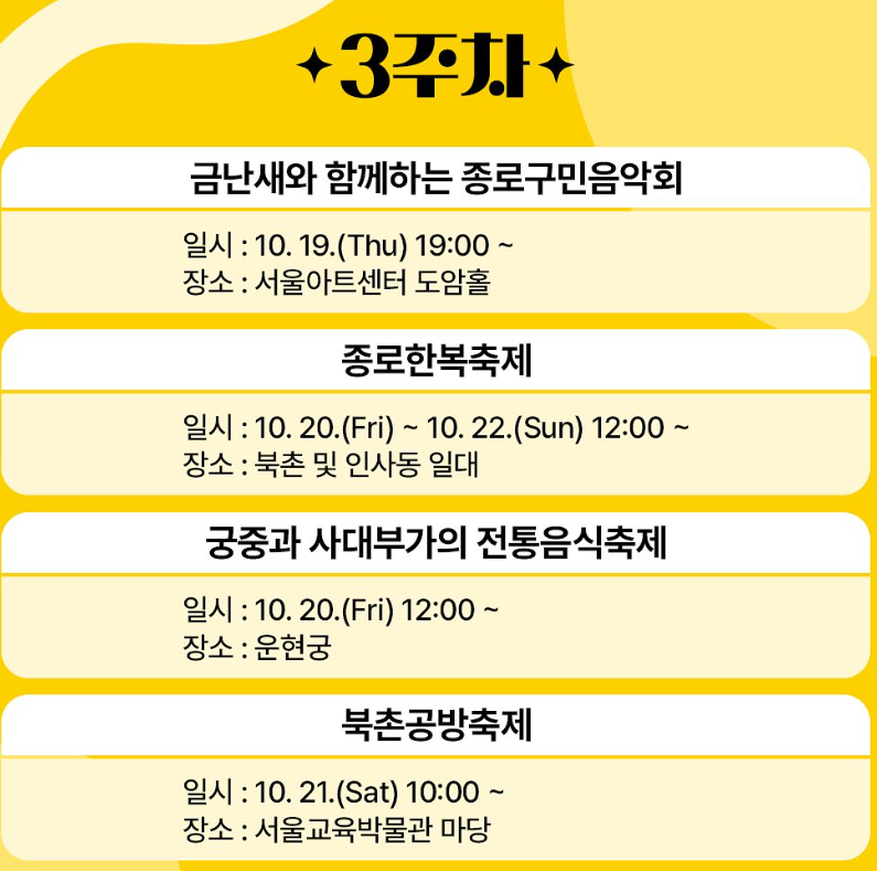 10월 3주) 종로한복축제, 북촌공방축제, 궁중과사대부가전통음식축제, 종로구민음악회