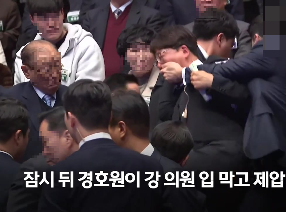 • 이후 대통령의 경호원이 강 의원의 입을 막으며 끌고 올라가는 장면이 발생합니다.