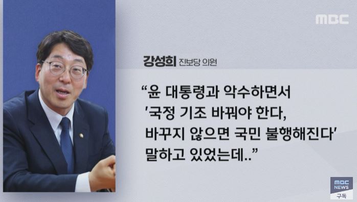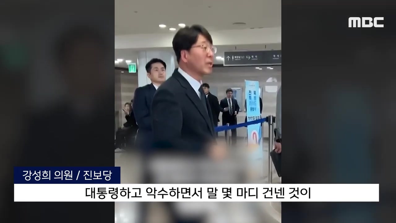 강 의원은 당시 윤석열 대통령과 악수를 하면서 '국정 기조를 바꿔야 한다 바꾸지 않으면 국민이 불행해진다'는 말을 하고 있었는데, 말이 끝나기도 전에 경호원이 입을 틀어막았다고 전했습니다.