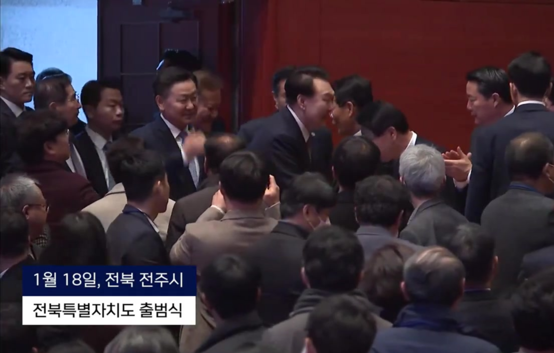 1. 전북 특별자치도 출범식에서 윤석열 대통령이 강성희 의원과 악수하다 경호원에게 뒤로 끌리는 상황 발생