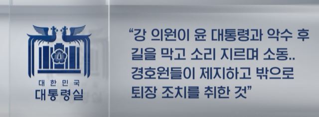 이와 관련해 대통령실 측은 강 의원이 윤 대통령과 악수하고 나서 귀를 막고 소리 지르며 소동을 일으켜 경호원들이 제지하고 행사장 밖으로 퇴장 조치를 취한 것이라고 설명했습니다.