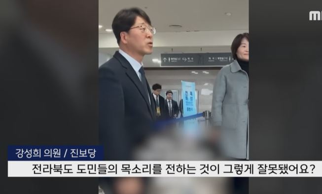 진보당 강성희 의원이 전북특별자치도 출범식 행사장에서 윤석열 대통령과 악수하며 말을 건네다 경호원들이 입을 막고 팔다리를 들어올려 행사장 밖으로 끌려나갔습니다.