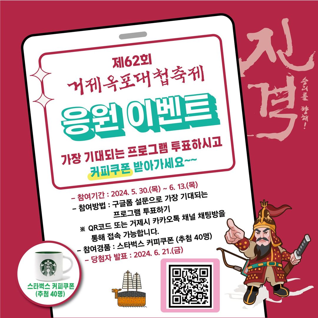 두근두근 옥포대첩축제! 2024. 6.14.(금) ~ 6.16.(일), 3일간 진행되는 거제 옥포대첩축제 여러분이 가장 기대하는 프로그램은 무엇인가요? 투표를 완료하신 분들 중 추첨을 통해 40분께 커피쿠폰을 보