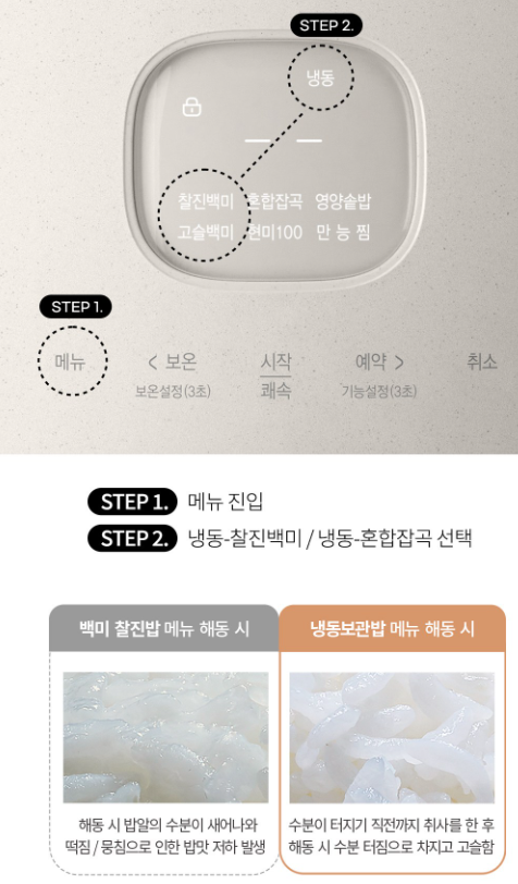 - 냉동보관밥 : 갓 지은 맛있는 밥맛을 오랫동안 보관 가능