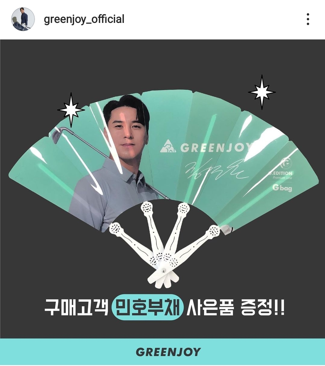 골프웨어 그린조이가 트로트 가수 장민호를 홍보모델로 발탁하고 '민호 부채'를 제작해서 그린조이 구매고객에게 '민호 부채'를 사은품으로 증정합니다. 증정 매장은 한정되어있습니다.