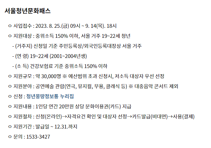 ▶ 서울청년문화패스 콜센터 : 1533-3427