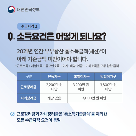 근로소득, 사업소득, 종교인소득이 있는 가구로서 다음 요건을 모두 충족해야 합니다.