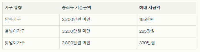 가구 유형별 총급여액 기준과 최대 지급액은 다음과 같습니다.
