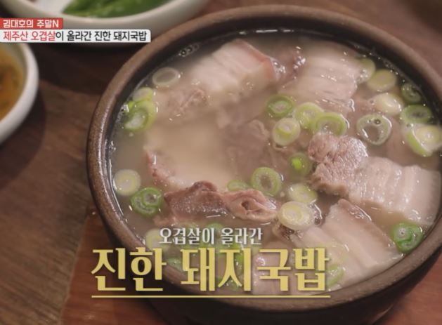 사골을 삶아낸 탱글탱글한 제주산 오겹살이 올라간 돼지국밥