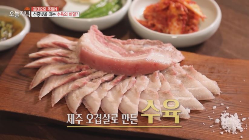 수육이 나왔습니다. 돼지고기가 약간 분홍빛이 도는데 제주산 오겹살을 사용하는데 제주돼지고기는 제주도에 있는 화산토를 먹고 크기 때문에 그 화산토에 철분 성분이 많습니다.