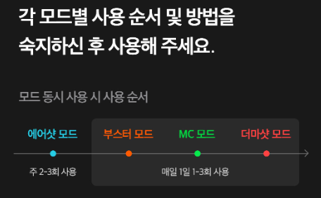 1) 에어샷모드 (2회 사용) -> 2) 부스터모드(매일 스킨케어 할 때) -> 3)MC 모드 -> 4) 더마샷 모드