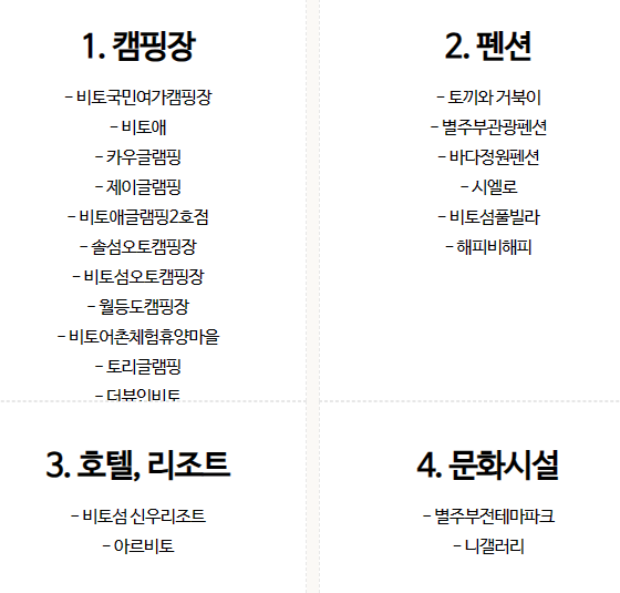 워낙 경치가 좋은 경남 사천 비토섬에는 다른 펜션, 글램핑장, 캠핑장 등이 많이 있습니다.