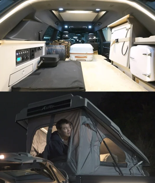 전현무는 혼자 드라이브와 캠핑을 즐기기 위해 기존의 큰 차량에서 컴팩트한 사이즈의 '뉴 무카'로 바꾸었다고 밝혔습니다. 이 차량은 특히 혼자서 차박을 즐기기에 적합한 모델로, 팝업 텐트를 통해 추가적인 수면 공간을 제공합니다