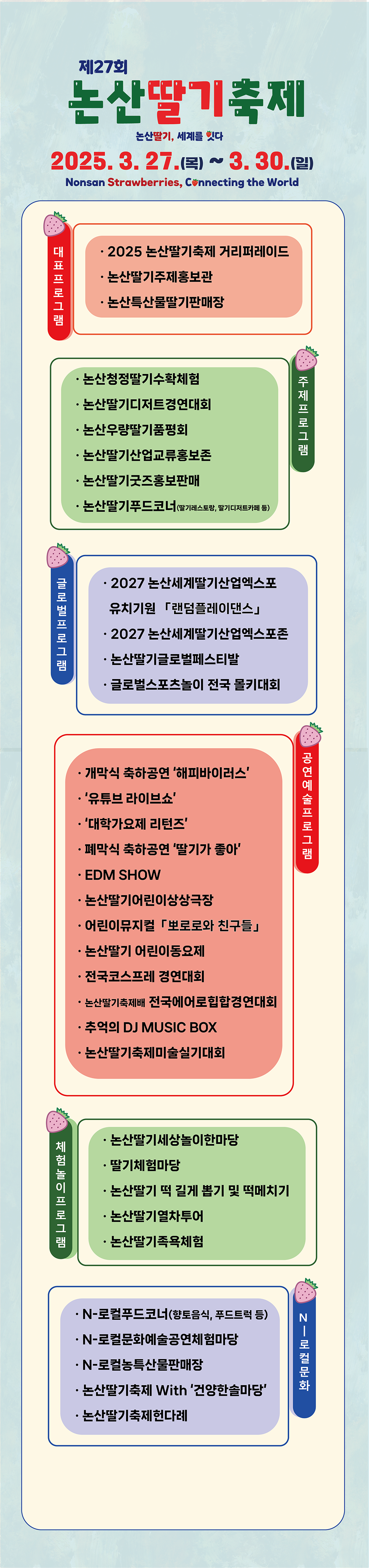 논산딸기축제는 단순한 농산물 축제를 넘어 지역의 문화와 역사, 그리고 사람들의 이야기가 담긴 소중한 행사입니다. 올해도 많은 분들이 찾아와 논산의 달콤한 봄을 만끽하시길 바랍니다. 여러분의 발걸음이 논산을 더욱 풍성하게 만들 거예요. 그럼 3월에 논산에서 만나요!