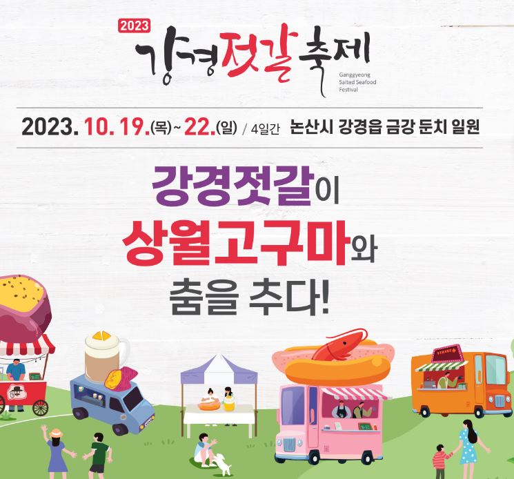 2023 강경젓갈축제가 10.19.(목) ~ 10.22.(일) 4일간 논산시 강경읍 금강둔치 일원에서 개최됩니다.