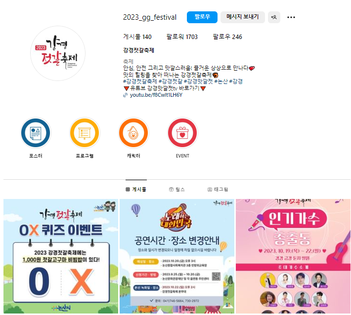 2023 강경젓갈축제가 10.19.() ~ 10.22.() 4일간 논산시 강경읍 금강둔치 일원에서 개최됩니다.