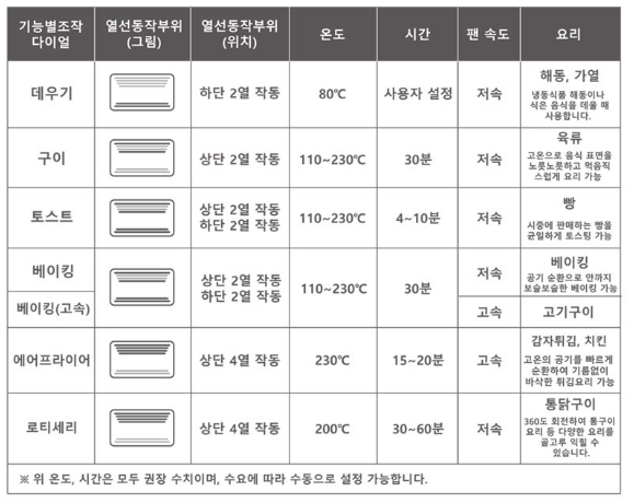 - 상하단 열선으로 더욱 빠르게 음식을 빠르고 고르게 가열해 빠른 조리가 가능합니다.
