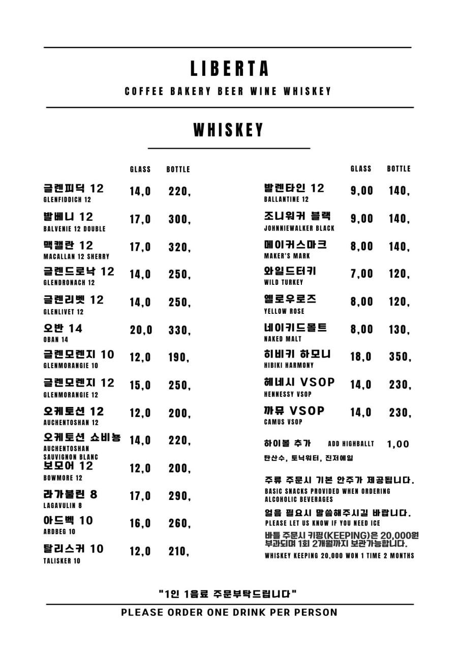 위스키 종류가 다양하게 준비되어 있는데 매일 직접 생산하는 건강하고 신선한 베이커리를 제공합니다.