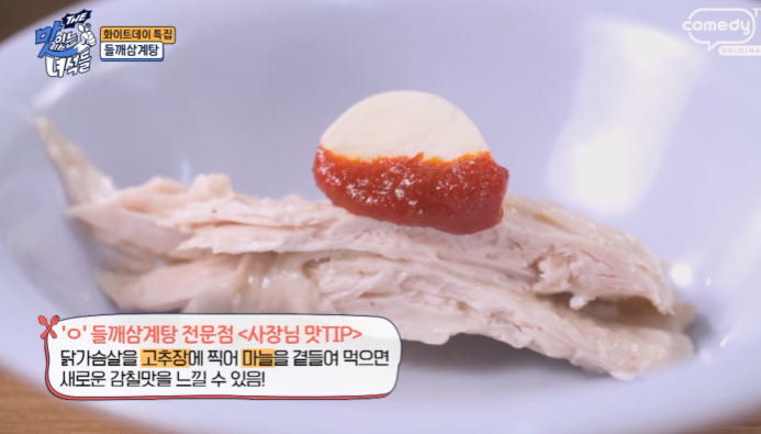 사장님께서 추천하시는 맛있게 먹는 방법이 있습니다. 닭가슴살을 고추장에 찍어 마늘과 함께 먹으면 새로운 감칠맛을 경험할 수 있다고 하네요. 이 조합으로 들깨삼계탕의 맛을 한층 더 끌어올릴 수 있습니다.