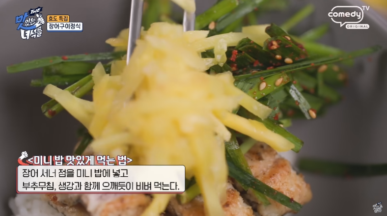밥에는 특제 장어소스가 뿌려져 나오며, 부추무침을 듬뿍 넣어 비벼 먹으면 장어의 고소함과 부추의 상큼함이 어우러져 느끼함 없이 깔끔하게 즐길 수 있습니다.