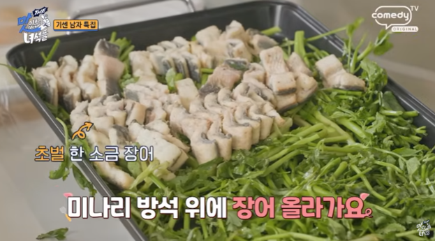 장어는 초벌로 쪄서 미나리와 함께 제공됩니다.