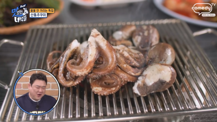 이곳의 대표 메뉴인 산통쭈꾸미는 그 크기가 거의 낙지만 해서 놀랄 정도예요. 살아있는 통쭈꾸미를 불판 위에 올려 구워먹는데, 먹물을 쏠 수 있어 쟁반으로 덮어 익힌답니다. 노릇하게 구워진 쭈꾸미는 짭쪼름하면서도 맛이 아주 좋다고 해요. 특히 불에 살짝 그슬린 다리 부위가 일품이라고 하네요.