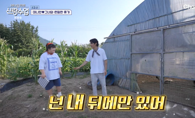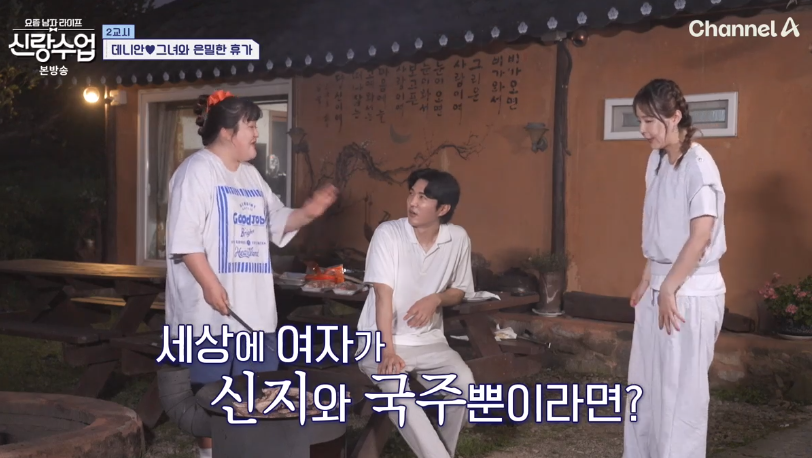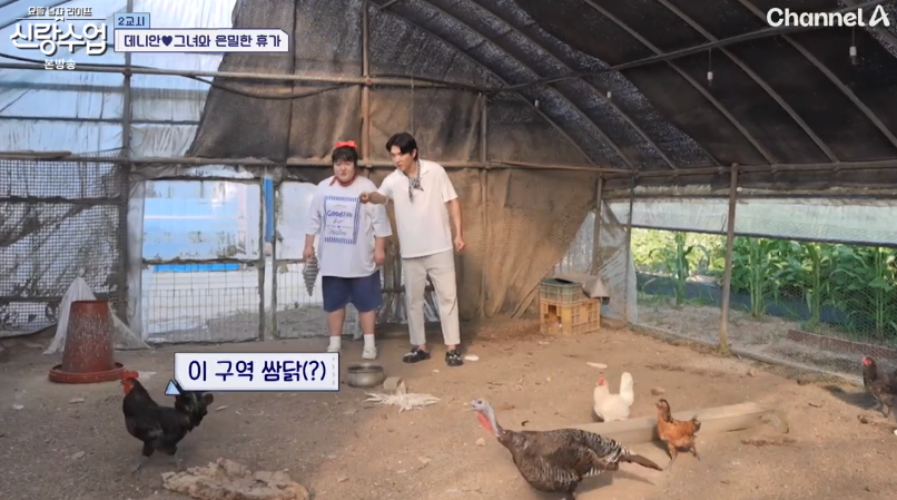 데니안은 신지와 커플룩처럼 일바지를 맞춰 입고 텃밭에서 요리할 채소를 수확했고, 이국주는 고기를 손질하며 두사람을 기다렸습니다. 두사람은 함께 닭장에서 달걀도 챙기며 즐거운 시간을 보냈습니다. 이국주는 “신지와 나 둘 중 누구랑 사귈 거냐”는 질문을 던졌고, 데니안은 "국주!"라고 답하며 농담을 던져 분위기를 더욱 화기애애하게 만들었습니다.
