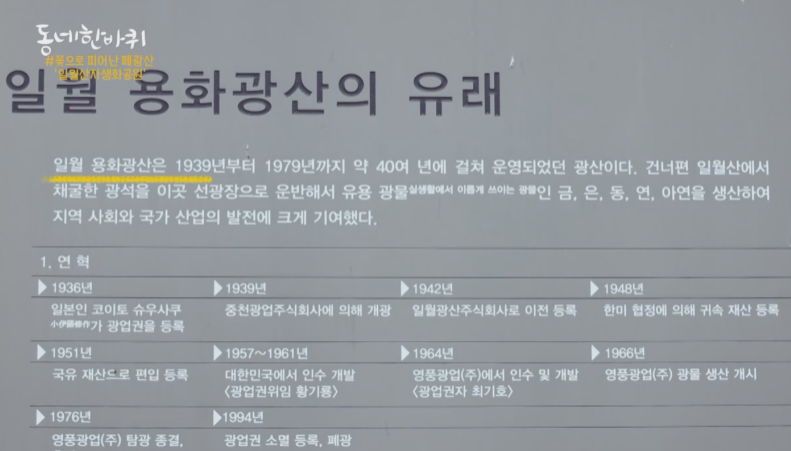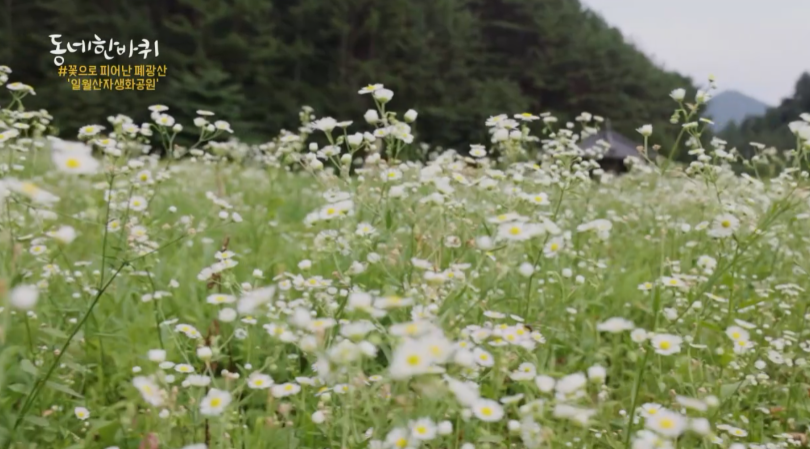 일월산은 그 풍경만큼이나 흥미로운 역사와 이야기를 품고 있는 곳입니다. 1939년부터 40년간 운영되었던 일제 강점기의 영화 광산은 이제 폐광이 되어 사람들의 기억 속에만 남아 있습니다. 한때 이곳은 일제가 금속 재료를 채굴하기 위해 세운 광산으로, 화학물질로 인해 오염된 땅이 되어버렸습니다. 그러나 20여 년 전부터 오염된 흙을 정화하고 꽃씨를 뿌려 지금은 다양한 야생화가 피어나는 아름다운 자생화 공원으로 탈바꿈했습니다.