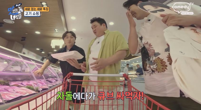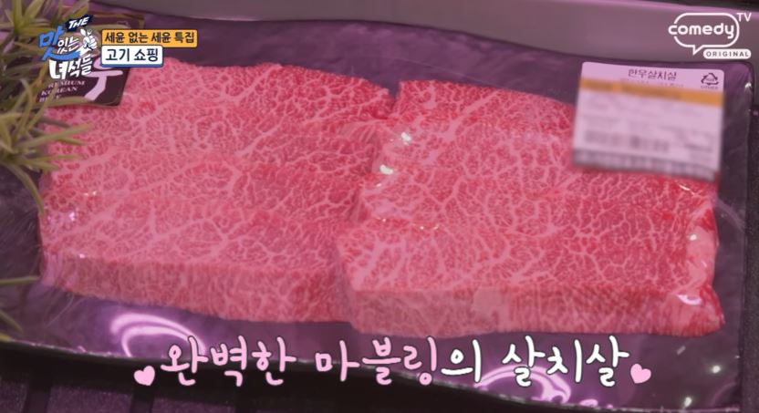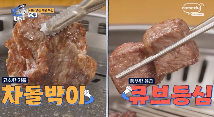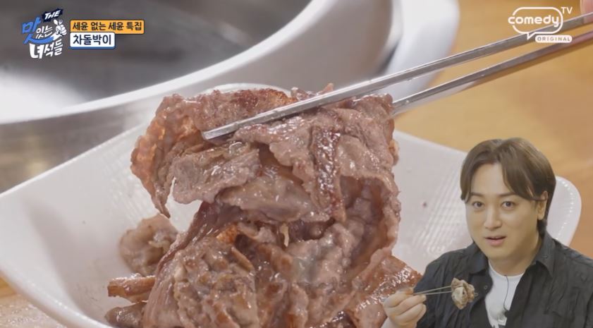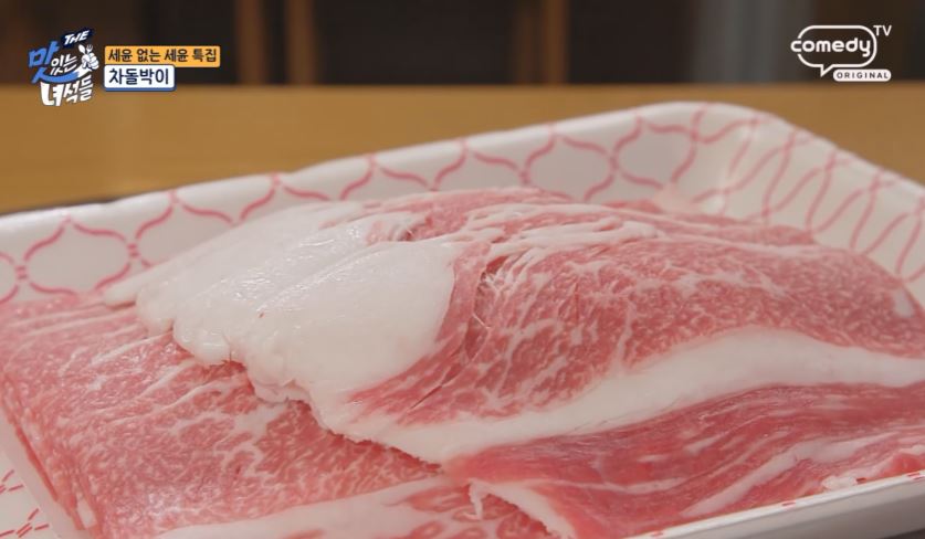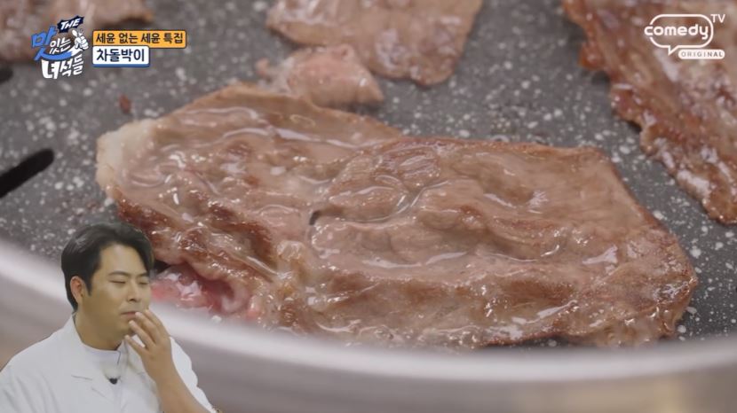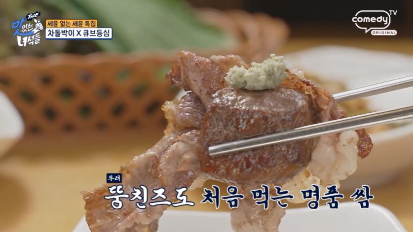 차돌박이가 기름기가 많아 부드럽고 고소한 맛 고기를 싸서 먹는 방식이 사치스럽지만 그만큼 맛있다고 차돌박이가 최근 트렌드에 맞춰 살짝 두껍게 썰려 있어 더욱 맛있다며 감탄합니다.
