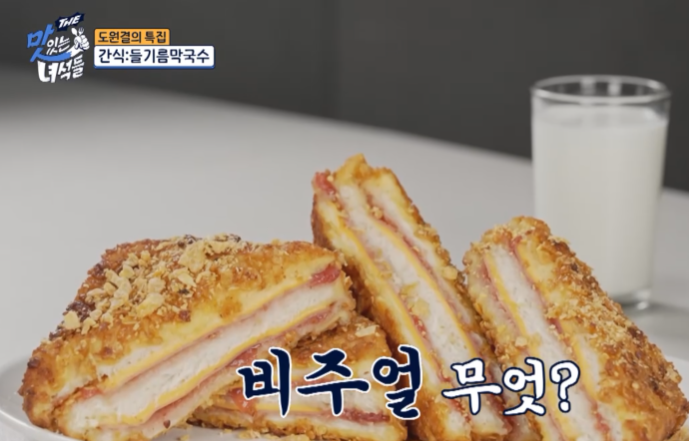식빵에 딸기잼, 슬라이스 햄, 치즈 올리기를 두번 반복하고 달걀 물에 골고루 적신 뒤 시리얼 묻히기 녹인 버터에 노릇노릇 구우면 됩니다.