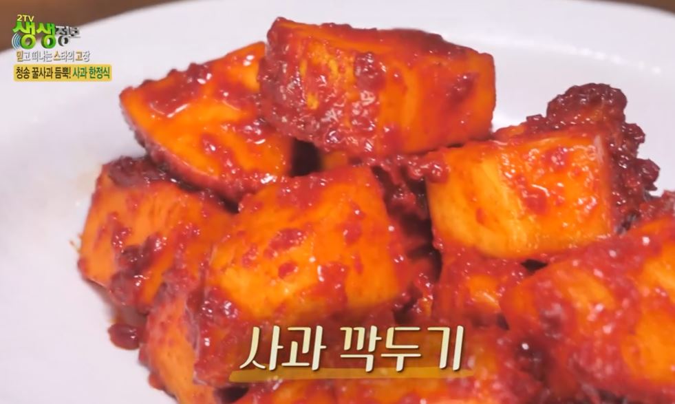 무가 아니라 사과에 양념을 묻힌 사과 깍두기 사과 말랭이를 넣어 부드러운 식감과 감칠맛을 더한 코다리찜.