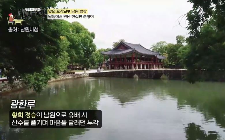 맛의 오작교 남원밥상 남원에서 만난 현실판 춘향이 광한루 황희 정승이 남원으로 유배 시 산수를 즐기며 마음을 달래던 누각 봄의 절정을 맞은 남원의 근사한 정원에서 배우 구혜선과 함께합니다.