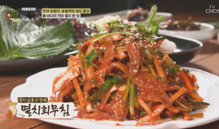 멸치회무침은 상큼하고 향긋한 깻잎과 참나물의 조화가 돋보이는 메뉴로, 봄철 입맛을 돋우기에 제격입니다.