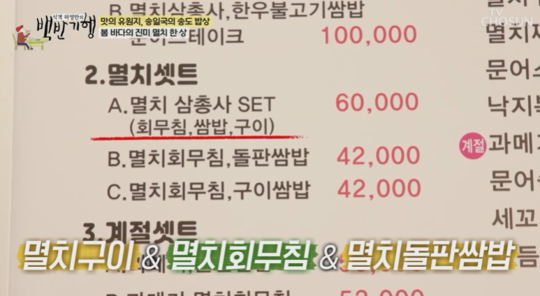 세트 메뉴: 다양한 조합으로 멸치 요리를 한 번에 맛볼 수 있습니다. 예) 멸치회무침(소) + 돌판멸치쌈밥(2인) = 38,000원.
