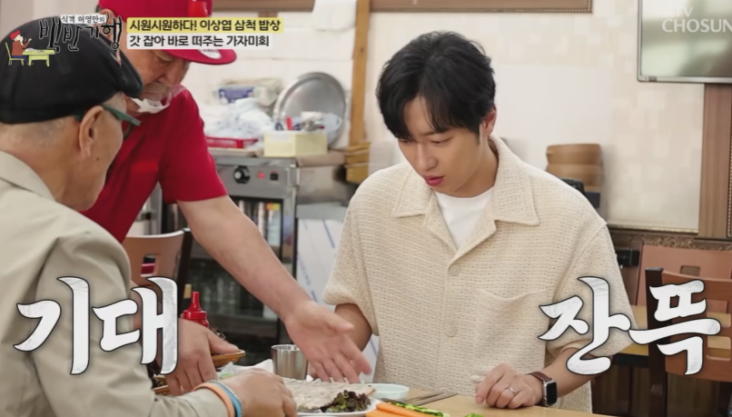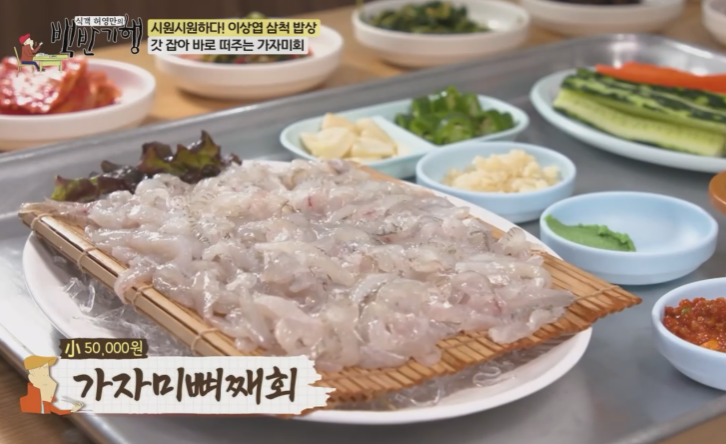 시원시원한 이상엽 배우와 함께하는 삼척 밥상 명불허전 삼척의 곰치와 갓 잡아 바로 떠주는 가자미회 뼈째 썰어주는 회는 꼬소하고 싱싱합니다. 은은하게 퍼지는 옅은 고소함으로 다른 생선에서는 쉽게 찾아볼 수 없는 맛이 뼈에서 나오고 양념된장을 듬뿍 찍어서 먹으면 회가 더 달아지고 맛있게 먹을 수 있습니다.