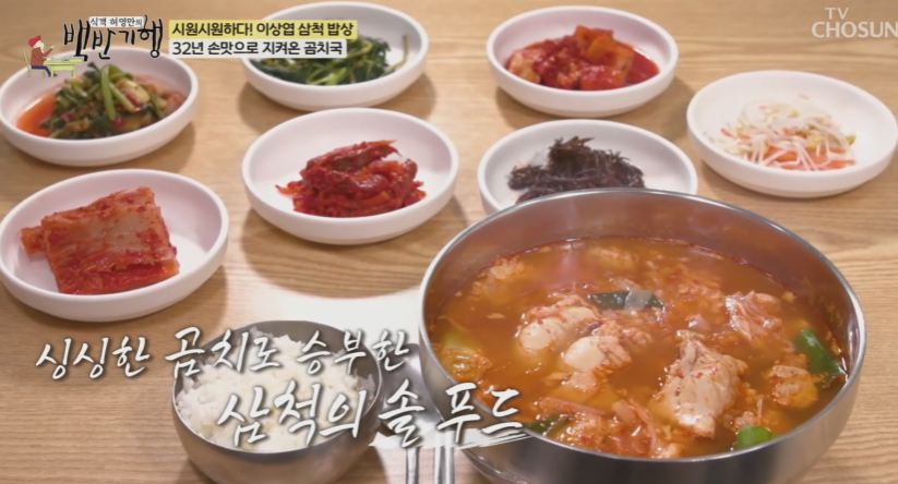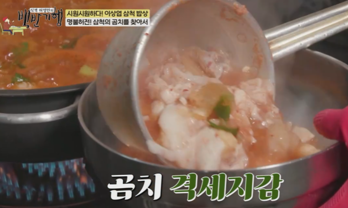 속을 훑어내리는 별미 곰치국은 동해안 삼척의 대표 향토 음식으로 32년의 내공이 다긴 곰치국의 맛은 곰치에 묵은지가 들어가서 약간 시큰 맛이 매력적이고 속이 확 풀려서 해장국으로 많이 드십니다.