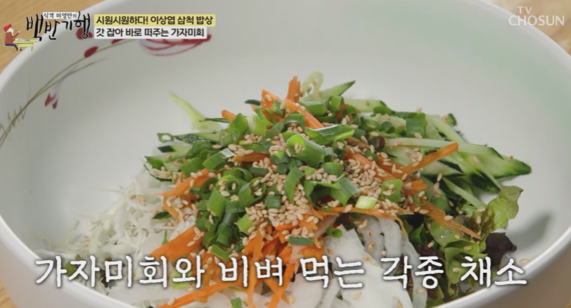 가자미 회는 비빔야채와 함께 비벼서 드시면 달콤하고 채소의 아삭함으로 식감이 더 다채로워집니다.
