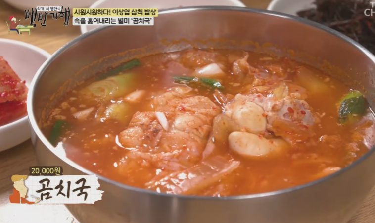 속을 훑어내리는 별미 곰치국은 동해안 삼척의 대표 향토 음식으로 32년의 내공이 다긴 곰치국의 맛은 곰치에 묵은지가 들어가서 약간 시큰 맛이 매력적이고 속이 확 풀려서 해장국으로 많이 드십니다.