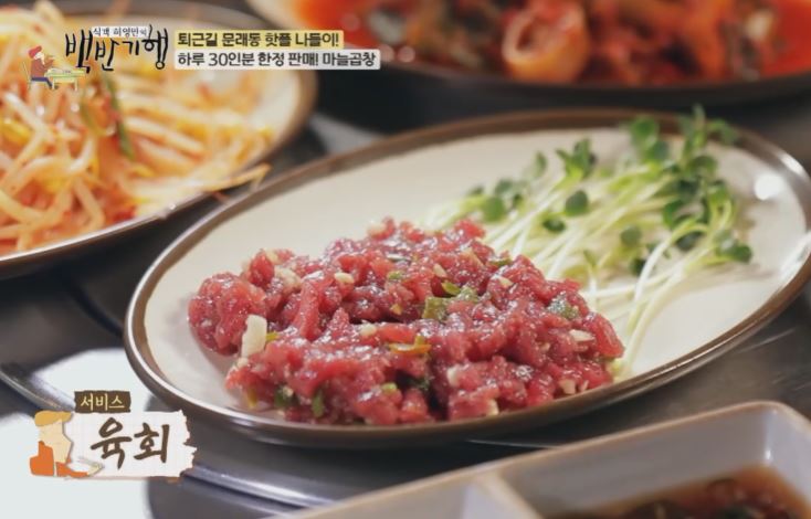 곱창집에 서비스로 순두부찌개, 육회가 나옵니다.