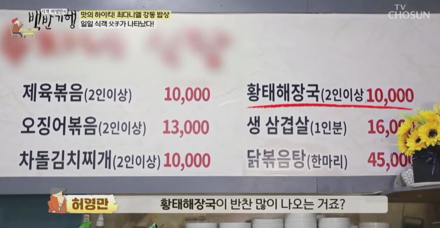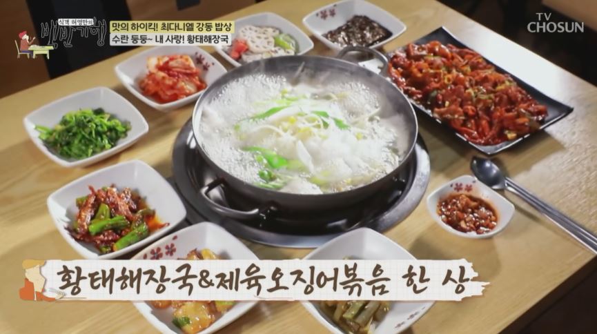 허영만 선생님과 최다니엘이 국물 먼저 먹업는데 국물의 간이 적당하며 맛있다고 합니다. 황태는 새우젓이 안들어가면 안된다고 합니다.
