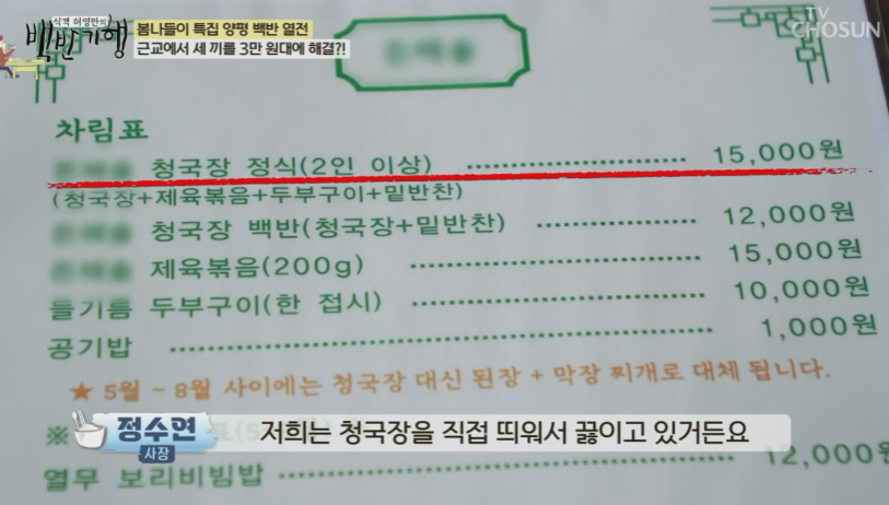 5~8월에는 청국장 대신 된장+막장찌개로 대체됩니다.