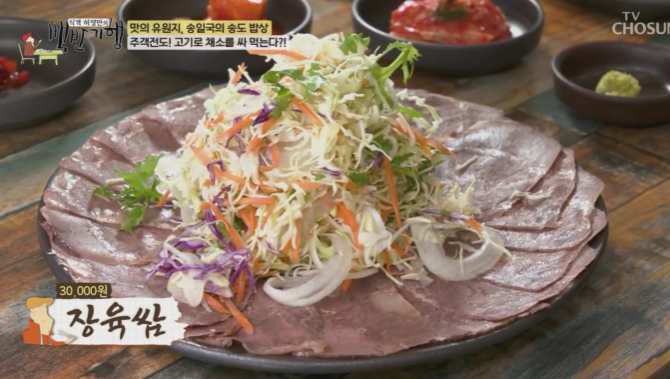 얇게 썬 부드러운 소고기에 신선한 야채를 싸먹는 별미. 장국밥과 함께 즐기면 더욱 풍성한 식사가 됩니다.