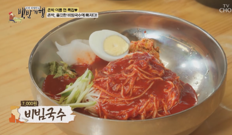 비빔국수는 소면을 사용해 매콤한 양념이 면에 잘 배어들어 맛이 일품이었습니다. 존박은 특히 비빔국수의 쫄깃한 면발과 양념의 조화에 매료되었고, 허영만 선생님 역시 이곳의 전통 방식으로 만들어진 면발의 식감과 맛에 감탄했습니다.