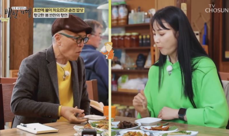 식객 허영만의 백반기행은 호반의 도시 춘천에서 왕년에 엄청난 인기를 끌었던 기상캐스터 안혜경씨와 함께 산골짜기 숨은 맛집 춘천 밥상 감자밥, 메밀배추전, 메밀두릅전, 코다리시래기찜을