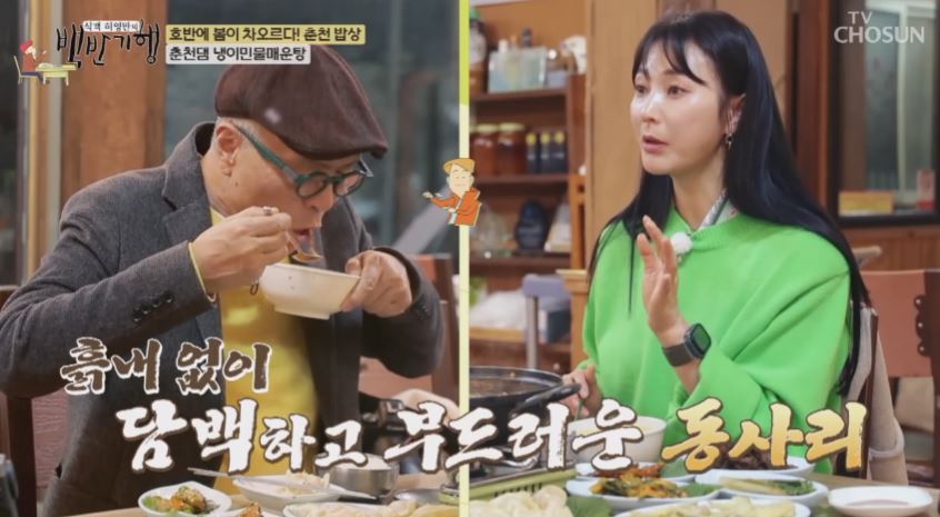 식객 허영만의 백반기행은 호반의 도시 춘천에서 왕년에 엄청난 인기를 끌었던 기상캐스터 안혜경씨와 함께 산골짜기 숨은 맛집 춘천 밥상 감자밥, 메밀배추전, 메밀두릅전, 코다리시래기찜을