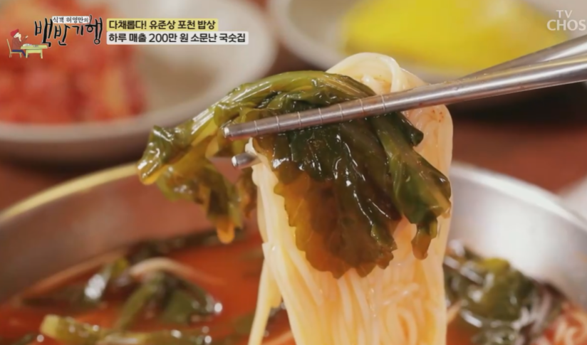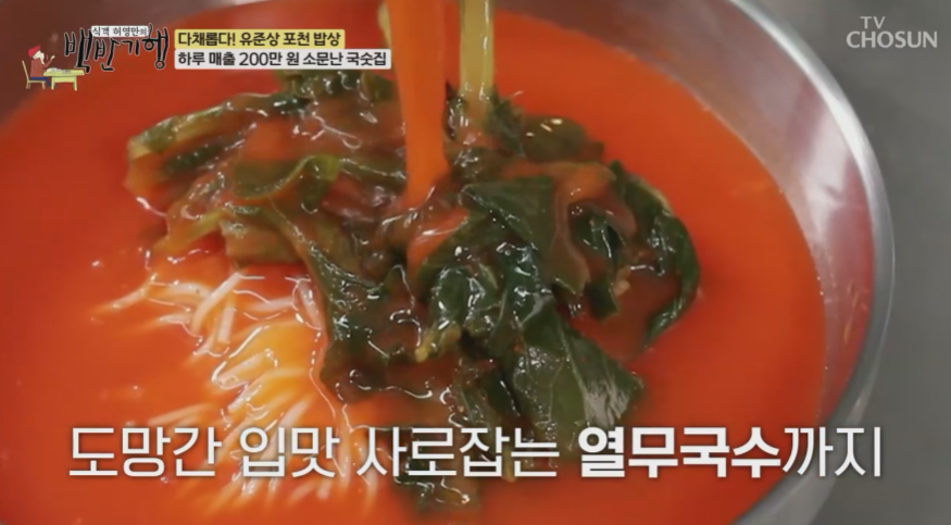 열무국수를 맛본 유준상은 "국물이 매운 것 같지 않다"고 말했고, 허영만 역시 "전혀 맵지 않다"고 덧붙였습니다. 특히 유준상은 "정말 너무 맛있다. 직접 와서 드셔보셔야 한다"고 강력 추천했고,  "꼬들꼬들하고 약간 쓴 맛이 난다"고 열무김치의 맛을 설명했습니다.