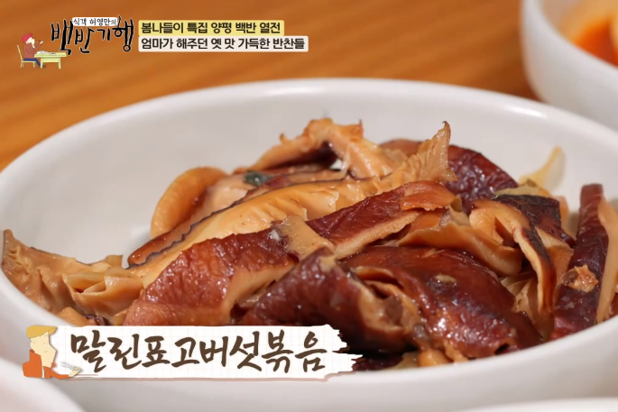 말린표고버섯볶음은 참나무에서 키워 향이 풍부하고 감자조림은 간장을 쓰지 않고 고춧가루, 파, 다진 마늘, 소금, 참기름으로 양념합니다.