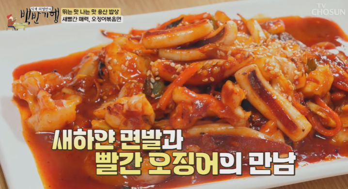 매콤한 양념에 쫄깃한 오징어와 면발의 조화!